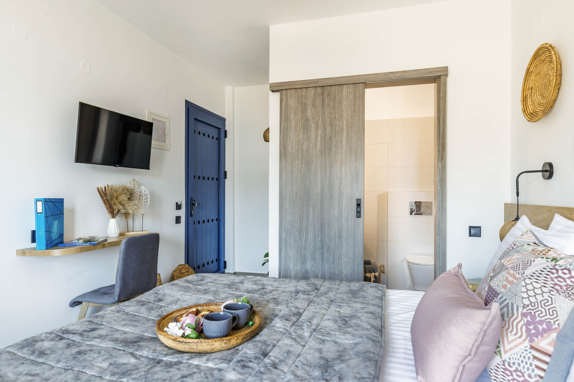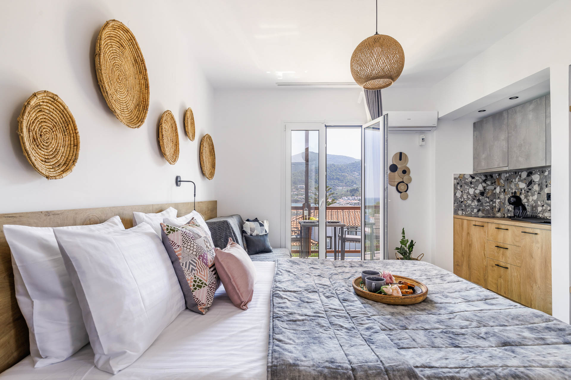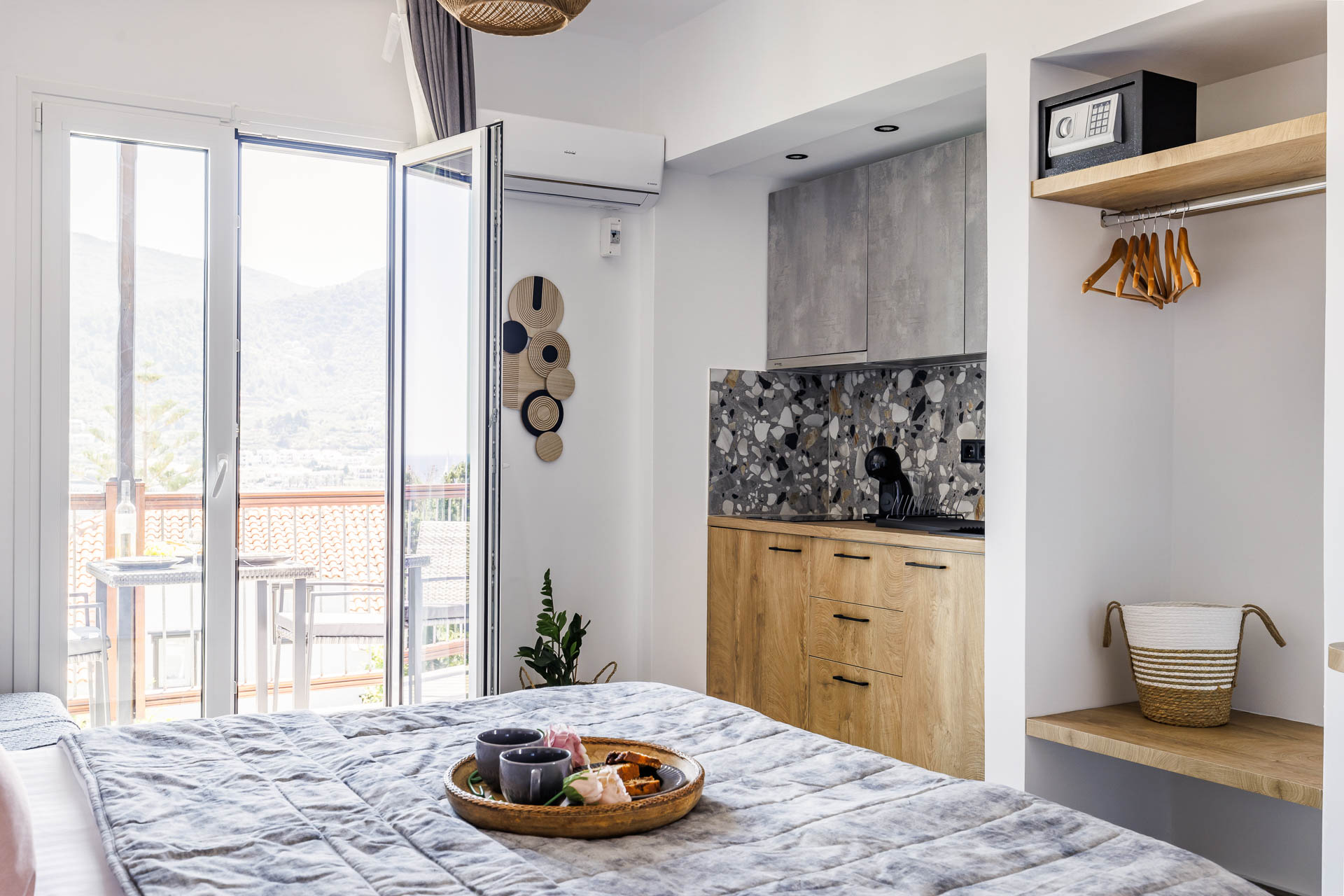 The studio is designed with a clean aesthetic creating a bright and comfortable living space. From its position above the town, guests can enjoy views of the port, the surrounding houses, and the changing colors of the landscape from morning to evening. The location provides easy access to the center of Skopelos Town, while maintaining a more relaxed and quiet atmosphere away from the busy areas.